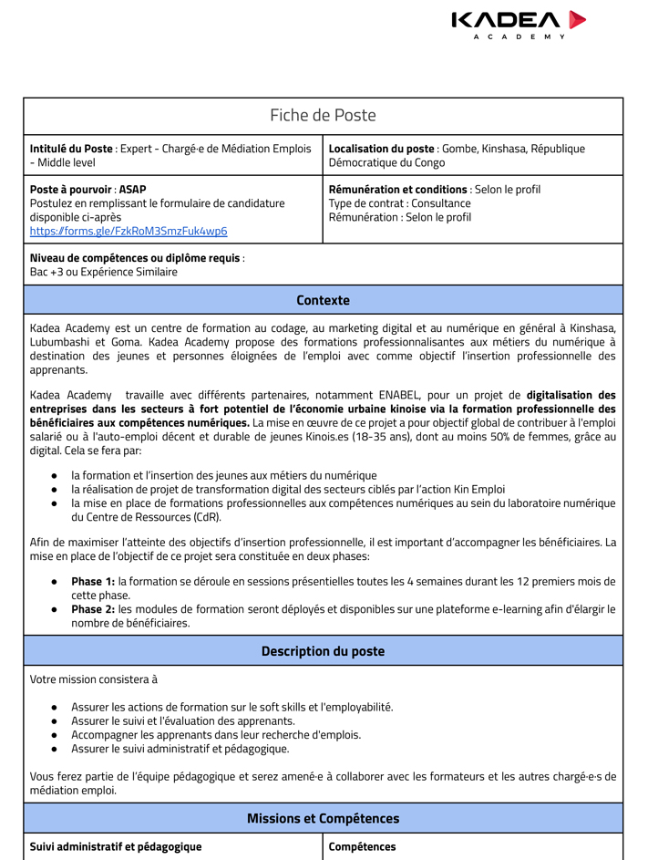 Expert - Chargé(e) de Médiation Emplois - Middle level