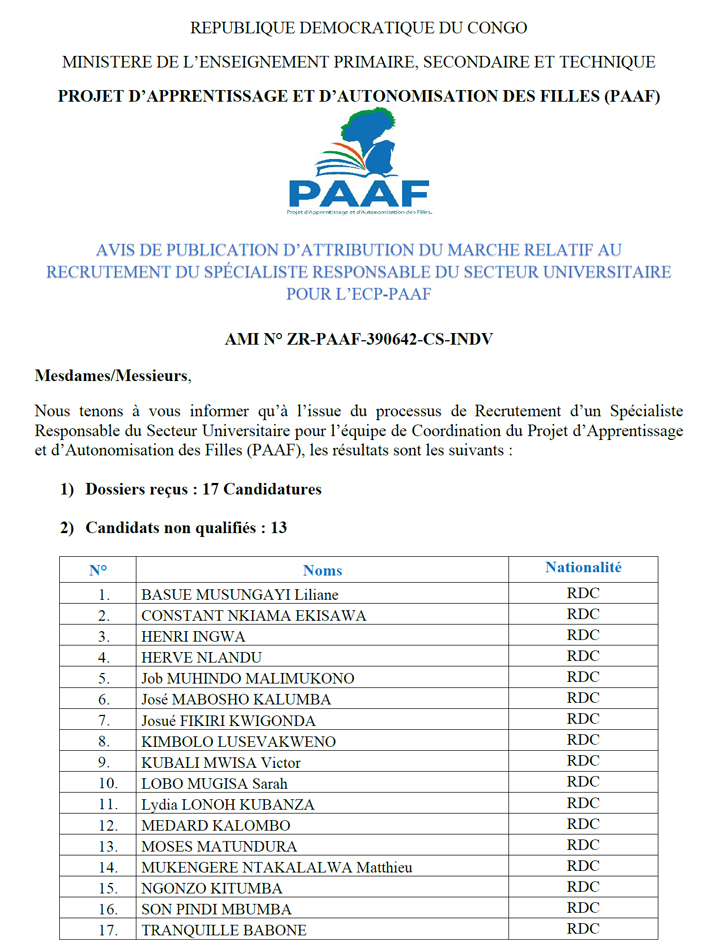 ATTRIBUTION DU MARCHE : Spécialiste Responsable du Secteur Universitaire pour l'ECP-PAAF
